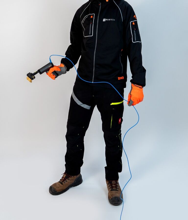 - Detekcia: Technik prechádza elektródou po suchom povrchu izolácie.